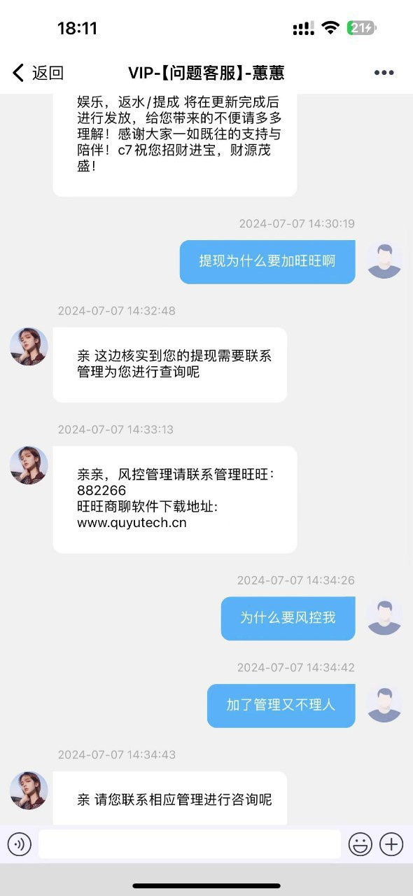 投稿南宫旗下的一个平台C7娱乐,我一个朋友被黑款19万,全部正常下注,没有任何违规行为,一开始提了15万,直接不让提让他加旺旺客服,旺旺客服根本就不回消息,然后我朋友就感觉被黑了就去拉电子100一拉,又赢了4万,我朋友就再次发起提现提了5万,显示到账了其实根本没到账,现在账号里还有14万完全提不出来了,旺旺客服完全不回消息,南宫这个平台玩的人还挺多的,曝光希望大家避雷