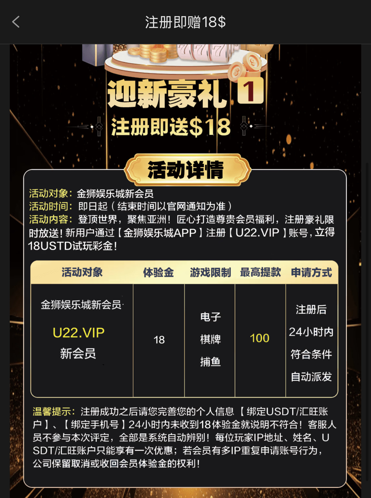 到账情况:自测【充值后果自负】 领取方式:注册登录完善资料申请领18 安全系数:低 平台资历:未知 会员评分:★☆☆☆☆ 申领网址:https://u22wy3.cc/?id=617458404 图例介绍