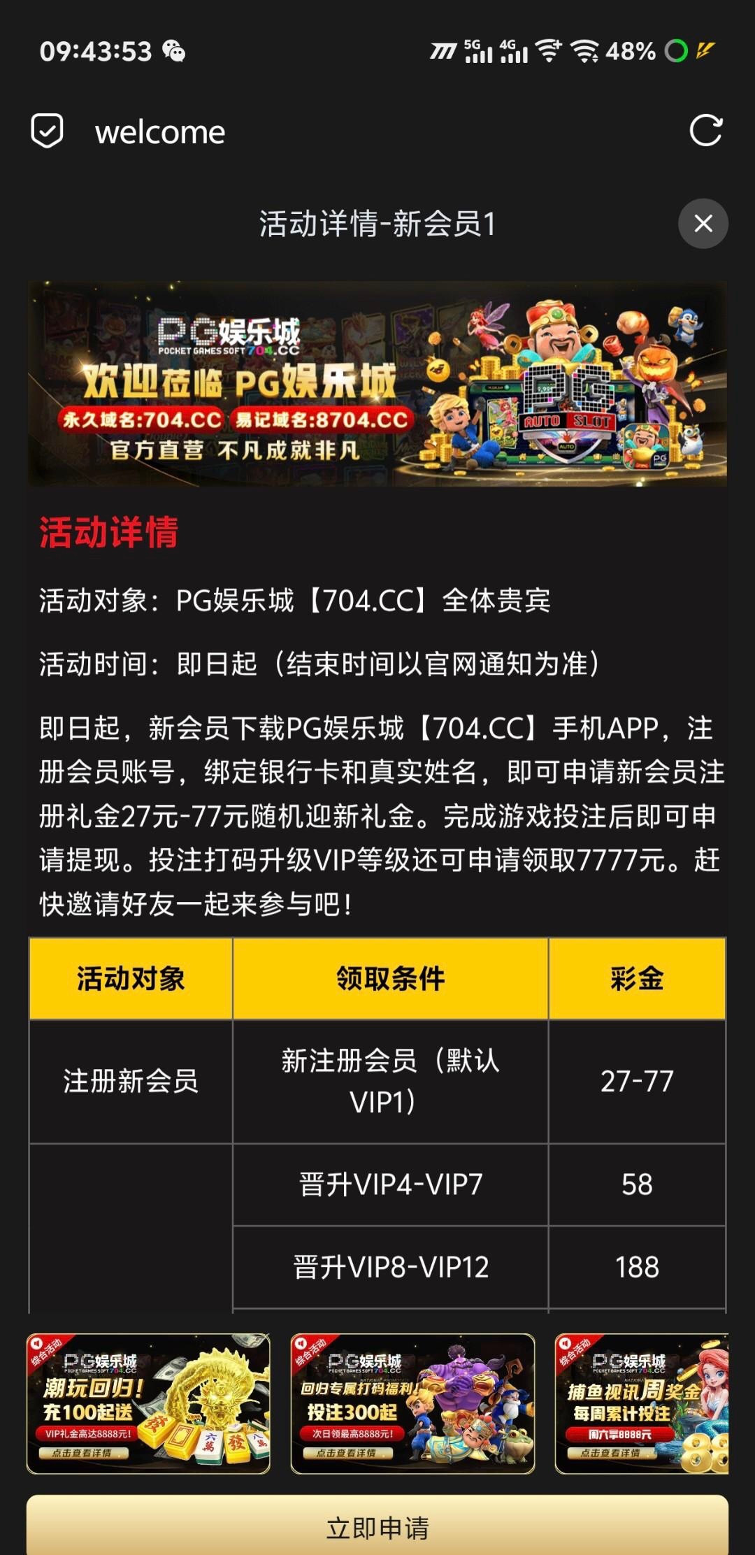 到账情况:自测【充值后果自负】 领取方式:注册绑卡申请送27-77 安全系数:低 平台资历:未知 会员评分:★☆☆☆☆ 申领网址:http://704.cc/ 提现要求:自行查看
