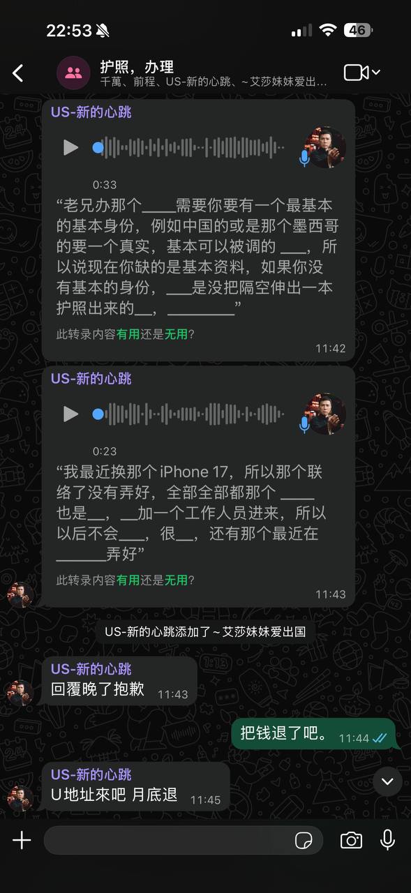 操他妈的结果护照拿到手后,我朋友在机场被当场拦下,关了十几天才放出来。所谓的墨西哥护照是假的!事后他一口答应赔钱,可一拖再拖,今天说明天转、明天又编借口,完全是在耍人。后来他又换了套路,说可以重新办瓦国护照或者“帮订机票酒店”来抵账。起初我还心软,以为他可能也是被人坑了,想着让他少赔点。